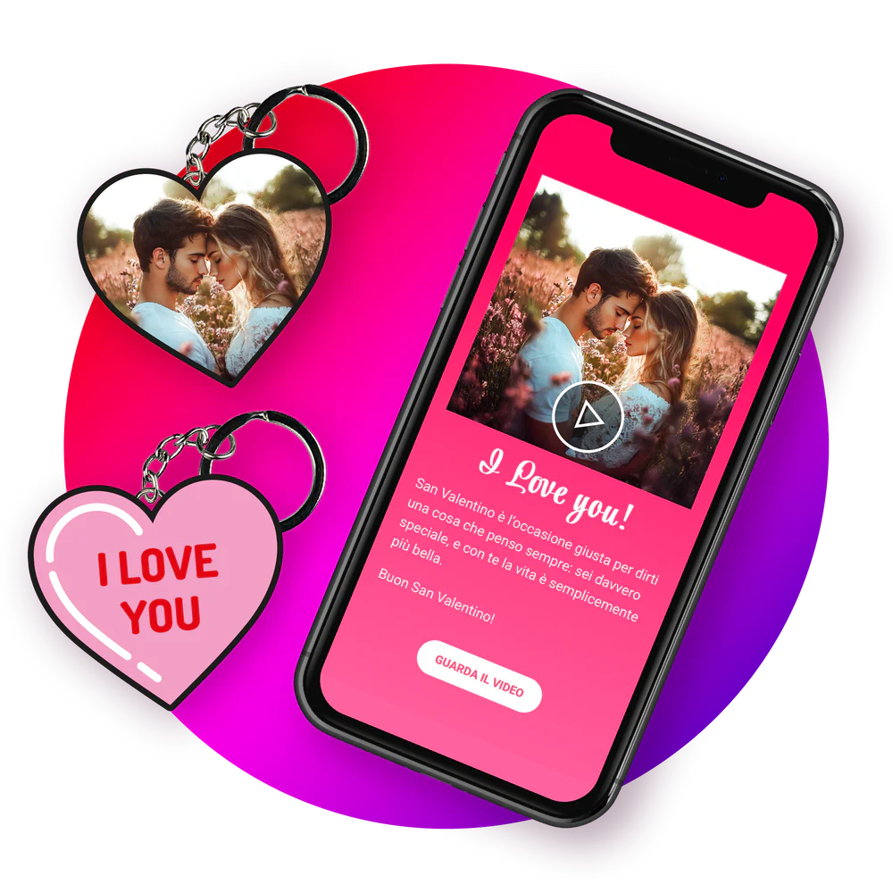 Personalizza la grafica del cuoricino su entrambi i lati con una foto e un breve messaggio. Inoltre, al suo interno può custodire un video speciale, una foto ricordo e una dolce dedica. Un regalo unico per racchiudere i tuoi momenti più belli!